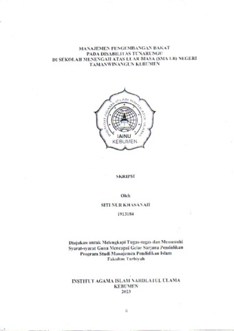 Siti Nur Khasanah, NIM.1913184 and Agus Salim Chamidi, M.Pd.I, . (2023) Manajemen Pengembangan Bakat pada Disabilitas Tunarungu di SMA LB Negeri Tamanwinangun Kebumen. Diploma thesis, Institut Agama Islam Nahdlatul Ulama ( IAINU) Kebumen.